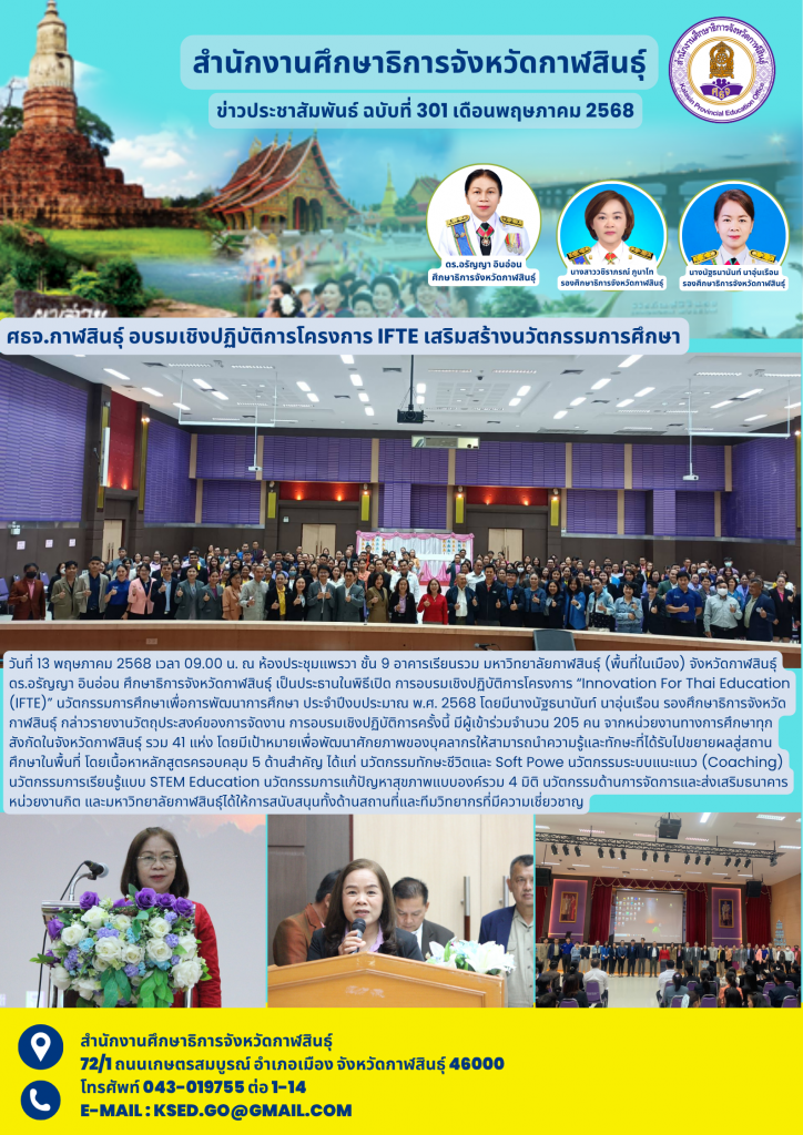 วันที่ 13 พฤษภาคม 2568 เวลา 09.00 น. ณ ห้องประชุมแพรวา ชั้น 9 อาคารเรียนรวม มหาวิทยาลัยกาฬสินธุ์ (พื้นที่ในเมือง) จังหวัดกาฬสินธุ์ ดร.อรัญญา อินอ่อน ศึกษาธิการจังหวัดกาฬสินธุ์ เป็นประธานในพิธีเปิด การอบรมเชิงปฏิบัติการโครงการ “Innovation For Thai Education (IFTE)” นวัตกรรมการศึกษาเพื่อการพัฒนาการศึกษา ประจำปีงบประมาณ พ.ศ. 2568 โดยมีนางนัฐธนานันท์ นาอุ่นเรือน รองศึกษาธิการจังหวัดกาฬสินธุ์ กล่าวรายงานวัตถุประสงค์ของการจัดงาน