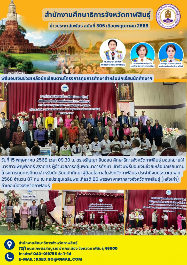 วันที่ 15 พฤษภาคม 2568 เวลา 09.30 น. ดร.อรัญญา อินอ่อน ศึกษาธิการจังหวัดกาฬสินธุ์ มอบหมายให้ นางสาวเพ็ญพักตร์ สุราฤทธิ์ ผู้อำนวยการกลุ่มพัฒนาการศึกษา เข้าร่วมพิธีมอบเงินช่วยเหลือนักเรียนตามโครงการทุนการศึกษาสำหรับนักเรียนนักศึกษาผู้ด้อยโอกาสในจังหวัดกาฬสินธุ์ ประจำปีงบประมาณ พ.ศ. 2568 จำนวน 87 ทุน ณ หอประชุมเฉลิมพระเกียรติ 80 พรรษา ศาลากลางจังหวัดกาฬสินธุ์ (หลังเก่า) อำเภอเมืองจังหวัดกาฬสินธุ์