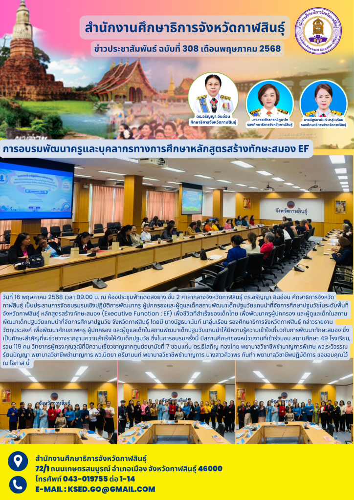 วันที่ 16 พฤษภาคม 2568 เวลา 09.00 น. ณ ห้องประชุมฟ้าแดดสงยาง ชั้น ๒ ศาลากลางจังหวัดกาฬสินธุ์ ดร.อรัญญา อินอ่อน ศึกษาธิการจังหวัดกาฬสินธุ์ เป็นประธานการจัดอบรมรมเชิงปฏิบัติการพัฒนาครู ผู้ปกครองและผู้ดูแลเด็กสถานพัฒนาเด็กปฐมวัยแกนนำที่จัดการศึกษาปฐมวัยในระดับพื้นที่จังหวัดกาฬสินธุ์ หลักสูตรสร้างทักษะสมอง (Executive Function : EF) เพื่อชีวิตที่สำเร็จของเด็กไทย เพื่อพัฒนาครูผู้ปกครอง และผู้ดูแลเด็กในสถานพัฒนาเด็กปฐมวัยแกนนำที่จัดการศึกษาปฐมวัย จังหวัดกาฬสินธุ์ โดยมี นางนัฐธนานันท์ นาอุ่นเรือน รองศึกษาธิการจังหวัดกาฬสินธุ์ กล่าวรายงานวัตถุประสงค์ เพื่อพัฒนาศักยภาพครู ผู้ปกครอง และผู้ดูแลเด็กในสถานพัฒนาเด็กปฐมวัยแกนนำให้มีความรู้ความเข้าใจเกี่ยวกับการพัฒนาทักษะสมอง (Executive Function : EF) ซึ่งเป็นทักษะสำคัญที่จะช่วยวางรากฐานความสำเร็จให้กับเด็กปฐมวัย ซึ่งในการอบรมครั้งนี้ มีสถานศึกษาของหน่วยงานที่เข้าร่วมอบรมประกอบด้วย ศธจ.กาฬสินธุ์ (โรงเรียนเอกชน) จำนวน 49 โรงเรียน, สพป.กาฬสินธุ์ เขต 1 จำนวน 10 โรงเรียน, สพป.กาฬสินธุ์ เขต 2 จำนวน 10 โรงเรียน, สพป.กาฬสินธุ์ เขต 3 จำนวน 10 โรงเรียน, องค์การบริหารส่วนจังหวัดกาฬสินธุ์ จำนวน 12 โรงเรียน, เทศบาลเมืองกาฬสินธุ์ จำนวน 8 โรงเรียน, องค์กรปกครองส่วนท้องถิ่น จำนวน 10 โรงเรียน, ศูนย์พัฒนาเด็กเล็ก จำนวน 10 โรงเรียน รวมจำนวนทั้งสิ้น 119 คน โดยได้รับเกียรติจากวิทยากรผู้ทรงคุณวุฒิที่มีความเชี่ยวชาญต้านการพัฒนาทักษะสมอง EF สำหรับเด็กปฐมวัยโดยเฉพาะ จากศูนย์อนามัยที่ 7 ขอนแก่น ดร.ธิโสภิญ ทองไทย พยาบาลวิชาชีพชำนาญการพิเศษ พว.ระวิวรรณ รัตนปัญญา พยาบาลวิชาชีพชำนาญการ พว.นิตยา ศรีมานนท์ พยาบาลวิชาชีพชำนาญการ นางสาวศิวาพร กันทำ พยาบาลวิชาชีพปฏิบัติการ ขอขอบคุณไว้ ณ โอกาส นี้