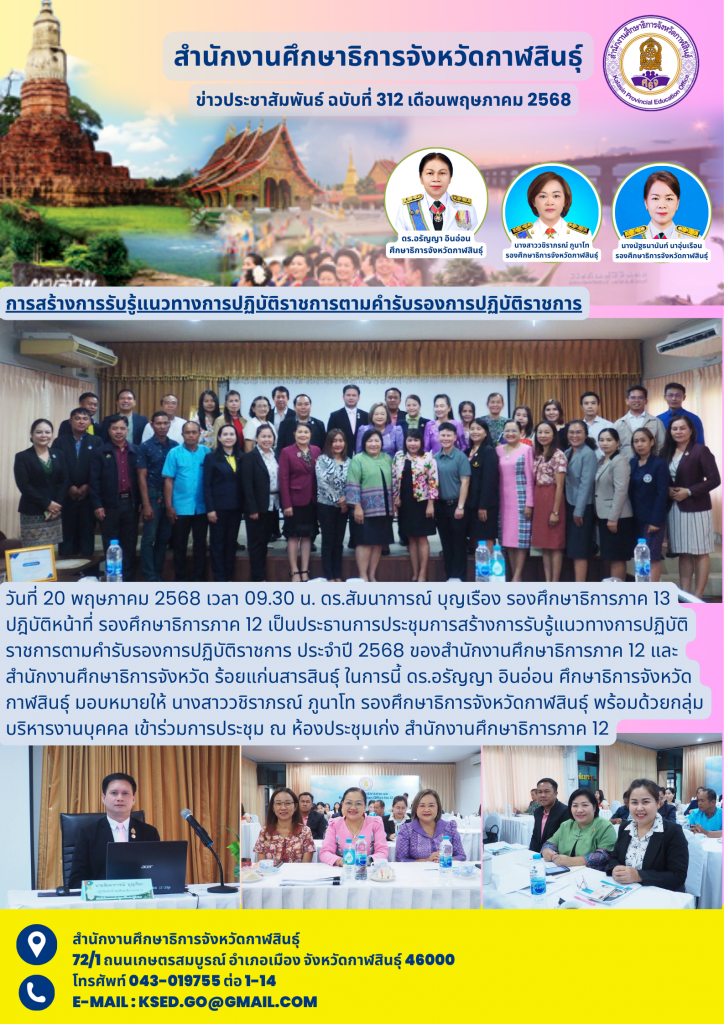 วันที่ 20 พฤษภาคม 2568 เวลา 09.30 น. ดร.สัมนาการณ์ บุญเรือง รองศึกษาธิการภาค 13 ปฎิบัติหน้าที่ รองศึกษาธิการภาค 12 เป็นประธานการประชุมการสร้างการรับรู้แนวทางการปฏิบัติราชการตามคำรับรองการปฏิบัติราชการ ประจำปี 2568 ของสำนักงานศึกษาธิการภาค 12 และสำนักงานศึกษาธิการจังหวัด ร้อยแก่นสารสินธุ์ ในการนี้ ดร.อรัญญา อินอ่อน ศึกษาธิการจังหวัดกาฬสินธุ์ มอบหมายให้ นางสาววชิราภรณ์ ภูนาโท รองศึกษาธิการจังหวัดกาฬสินธุ์ พร้อมด้วยกลุ่มบริหารงานบุคคล เข้าร่วมการประชุม ณ ห้องประชุมเก่ง สำนักงานศึกษาธิการภาค 12