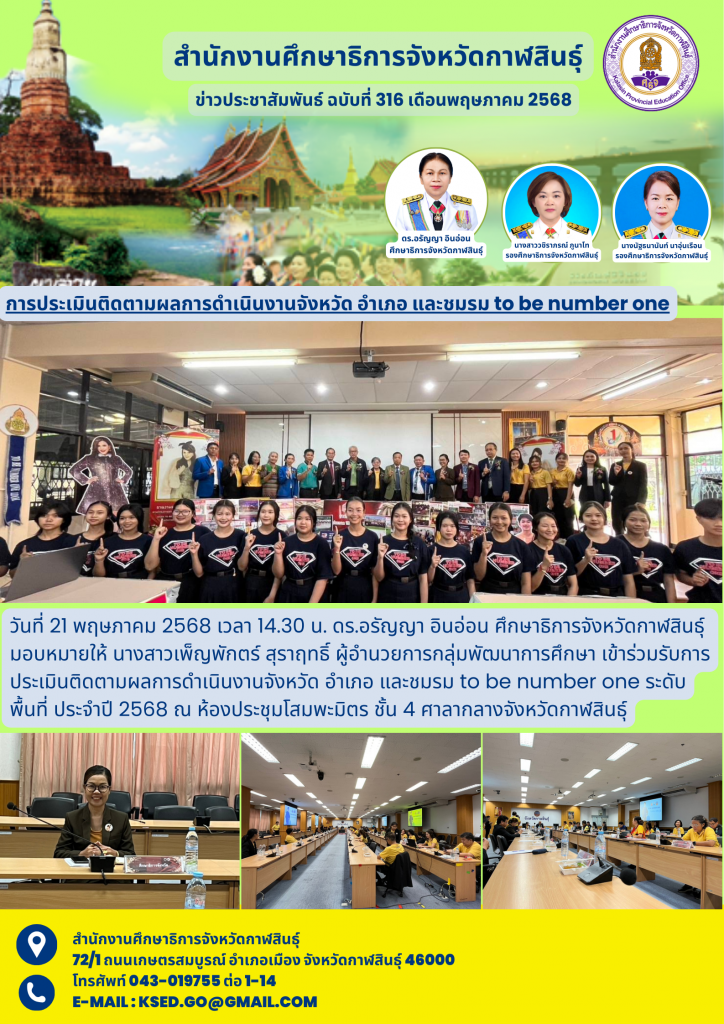 วันที่ 21 พฤษภาคม 2568 เวลา 14.30 น. ดร.อรัญญา อินอ่อน ศึกษาธิการจังหวัดกาฬสินธุ์ มอบหมายให้ นางสาวเพ็ญพักตร์ สุราฤทธิ์ ผู้อำนวยการกลุ่มพัฒนาการศึกษา เข้าร่วมรับการประเมินติดตามผลการดำเนินงานจังหวัด อำเภอ และชมรม to be number one ระดับพื้นที่ ประจำปี 2568 ณ ห้องประชุมโสมพะมิตร ชั้น 4 ศาลากลางจังหวัดกาฬสินธุ์