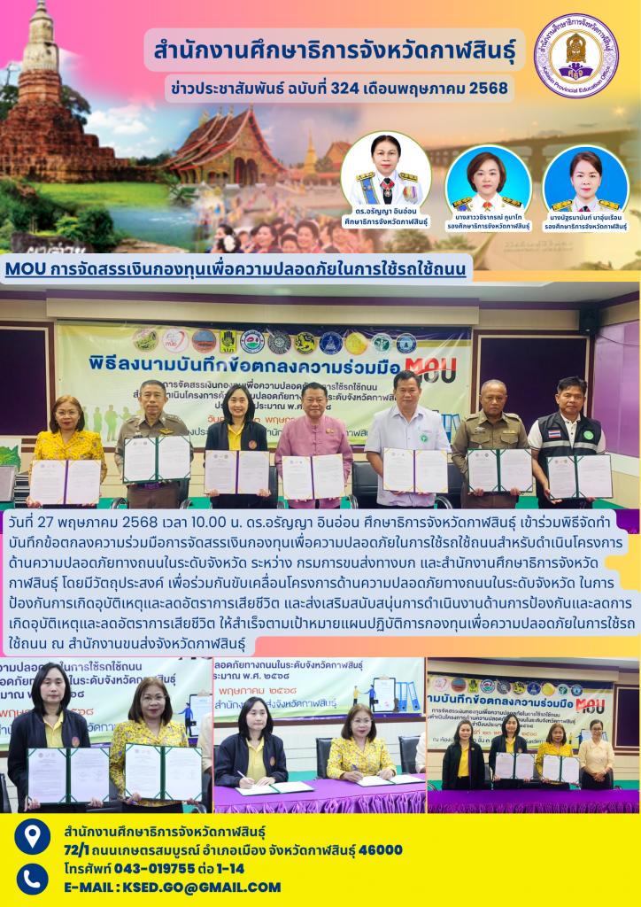 วันที่ 27 พฤษภาคม 2568 เวลา 10.00 น. ดร.อรัญญา อินอ่อน ศึกษาธิการจังหวัดกาฬสินธุ์ เข้าร่วมพิธีจัดทำบันทึกข้อตกลงความร่วมมือการจัดสรรเงินกองทุนเพื่อความปลอดภัยในการใช้รถใช้ถนนสำหรับดำเนินโครงการด้านความปลอดภัยทางถนนในระดับจังหวัด ระหว่าง กรมการขนส่งทางบก และสำนักงานศึกษาธิการจังหวัดกาฬสินธุ์ โดยมีวัตถุประสงค์ เพื่อร่วมกันขับเคลื่อนโครงการด้านความปลอดภัยทางถนนในระดับจังหวัด ในการป้องกันการเกิดอุบัติเหตุและลดอัตราการเสียชีวิต และส่งเสริมสนับสนุ่นการดำเนินงานด้านการป้องกันและลดการเกิดอุบัติเหตุและลดอัตราการเสียชีวิต ให้สำเร็จตามเป้าหมายแผนปฏิบัติการกองทุนเพื่อความปลอดภัยในการใช้รถใช้ถนน ณ สำนักงานขนส่งจังหวัดกาฬสินธุ์