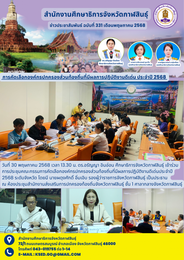 วันที่ 30 พฤษภาคม 2568 เวลา 13.30 น. ดร.อรัญญา อินอ่อน ศึกษาธิการจังหวัดกาฬสินธุ์ เข้าร่วมการประชุมคณะกรรมการคัดเลือกองค์กรปกครองส่วนท้องถิ่นที่มีผลการปฏิบัติงานดีเด่นประจำปี 2568 ระดับจังหวัด โดยมี นายผดุงศักดิ์ อิ่มเอิบ รองผู้ว่าราชการจังหวัดกาฬสินธุ์ เป็นประธาน ณ ห้องประชุมสำนักงานส่งเสริมการปกครองท้องถิ่นจังหวัดกาฬสินธุ์ ชั้น 1 ศาลากลางจังหวัดกาฬสินธุ์