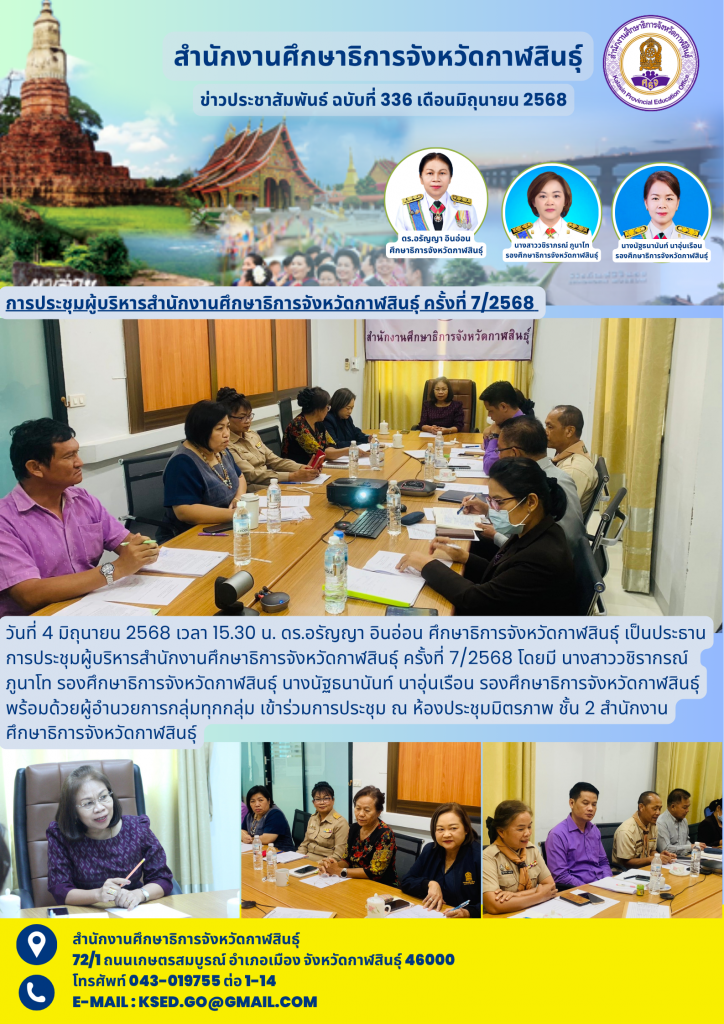 วันที่ 4 มิถุนายน 2568 เวลา 15.30 น. ดร.อรัญญา อินอ่อน ศึกษาธิการจังหวัดกาฬสินธุ์ เป็นประธานการประชุมผู้บริหารสำนักงานศึกษาธิการจังหวัดกาฬสินธุ์ ครั้งที่ 7/2568 โดยมี นางสาววชิรากรณ์ ภูนาโท รองศึกษาธิการจังหวัดกาฬสินธุ์ นางนัฐธนานันท์ นาอุ่นเรือน รองศึกษาธิการจังหวัดกาฬสินธุ์ พร้อมด้วยผู้อำนวยการกลุ่มทุกกลุ่ม เข้าร่วมการประชุม ณ ห้องประชุมมิตรภาพ ชั้น 2 สำนักงานศึกษาธิการจังหวัดกาฬสินธุ์