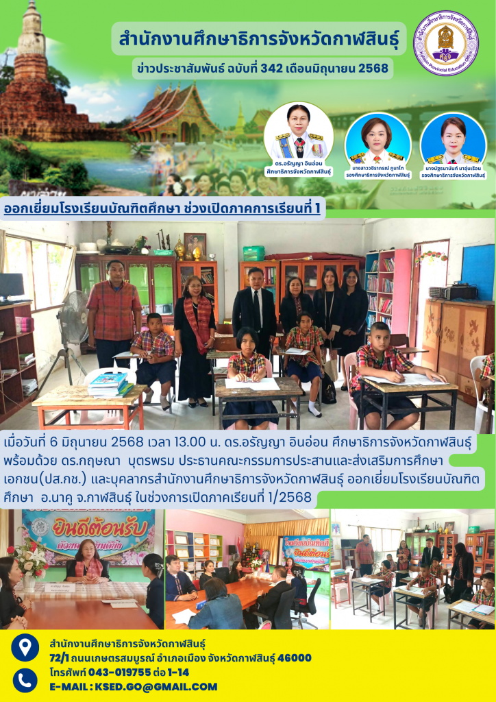 เมื่อวันที่ 6 มิถุนายน 2568 เวลา 13.00 น. ดร.อรัญญา อินอ่อน ศึกษาธิการจังหวัดกาฬสินธุ์ พร้อมด้วย ดร.กฤษณา บุตรพรม ประธานคณะกรรมการประสานและส่งเสริมการศึกษาเอกชน(ปส.กช.) และบุคลากรสำนักงานศึกษาธิการจังหวัดกาฬสินธุ์ ออกเยี่ยมโรงเรียนบัณฑิตศึกษา อ.นาคู จ.กาฬสินธุ์ ในช่วงการเปิดภาคเรียนที่ 1/2568