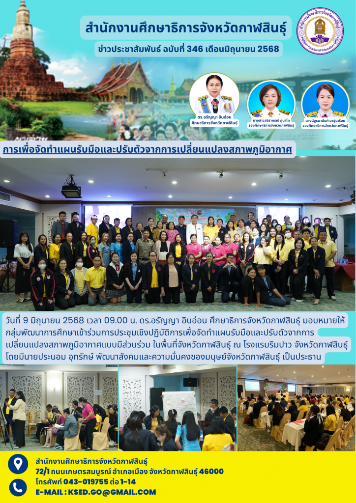 วันที่ 9 มิถุนายน 2568 เวลา 09.00 น. ดร.อรัญญา อินอ่อน ศึกษาธิการจังหวัดกาฬสินธุ์ มอบหมายให้ กลุ่มพัฒนาการศึกษาเข้าร่วมการประชุมเชิงปฏิบัติการเพื่อจัดทำแผนรับมือและปรับตัวจากการเปลี่ยนแปลงสภาพภูมิอากาศแบบมีส่วนร่วม ในพื้นที่จังหวัดกาฬสินธุ์ ณ โรงแรมริมปาว จังหวัดกาฬสินธุ์ โดยมีนายประนอม อุทรักษ์ พัฒนาสังคมและความมั่นคงของมนุษย์จังหวัดกาฬสินธุ์ เป็นประธาน
