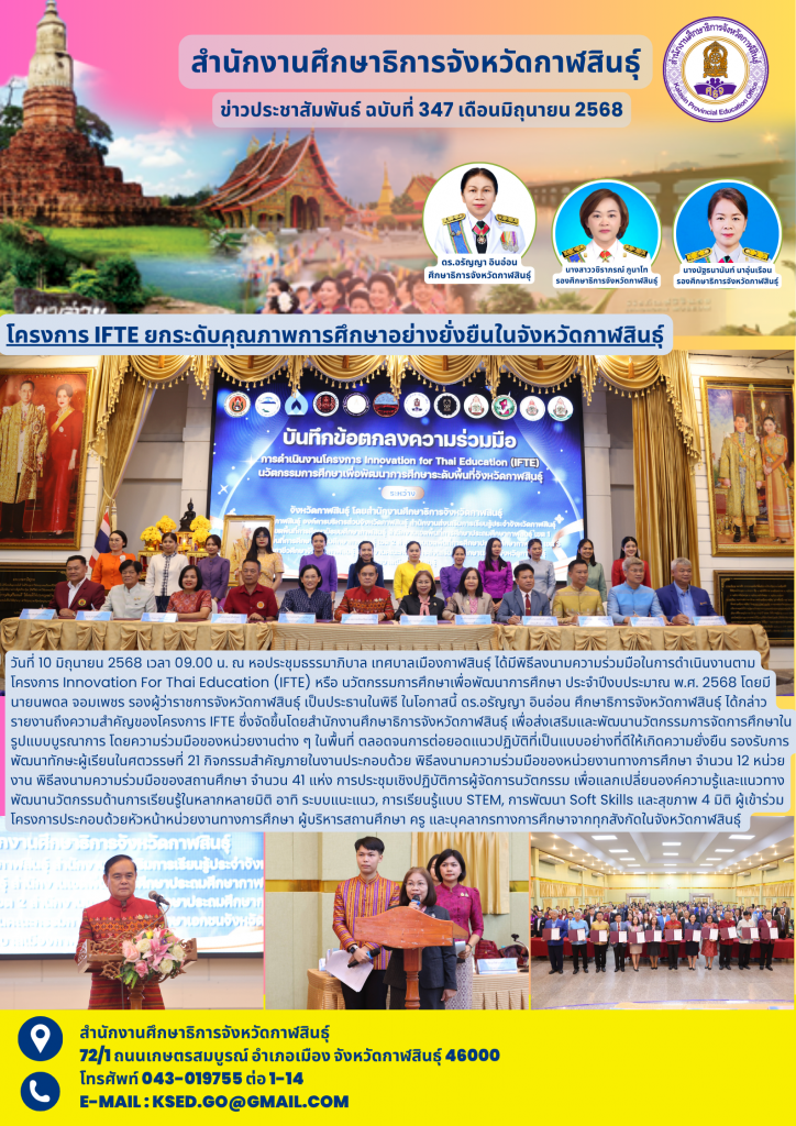 วันที่ 10 มิถุนายน 2568 เวลา 09.00 น. ณ หอประชุมธรรมาภิบาล เทศบาลเมืองกาฬสินธุ์ ได้มีพิธีลงนามความร่วมมือในการดำเนินงานตามโครงการ Innovation For Thai Education (IFTE) หรือ นวัตกรรมการศึกษาเพื่อพัฒนาการศึกษา ประจำปีงบประมาณ พ.ศ. 2568 โดยมี นายนพดล จอมเพชร รองผู้ว่าราชการจังหวัดกาฬสินธุ์ เป็นประธานในพิธี