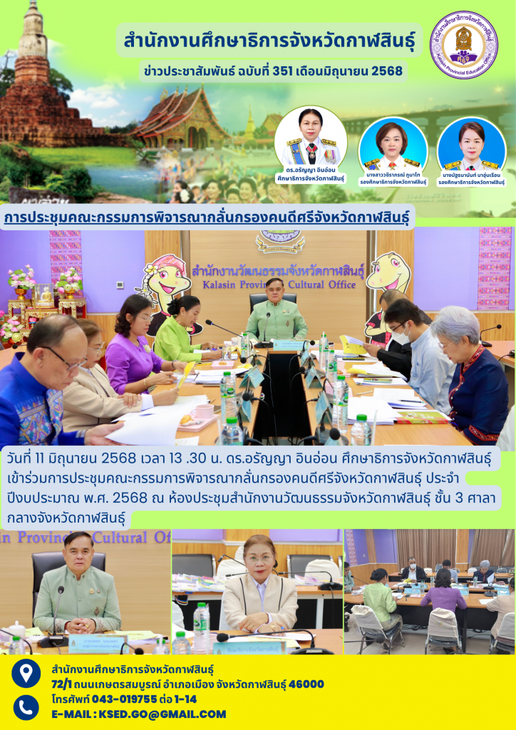 วันที่ 11 มิถุนายน 2568 เวลา 13.30 น. ดร.อรัญญา อินอ่อน ศึกษาธิการจังหวัดกาฬสินธุ์ เข้าร่วมการประชุมคณะกรรมการพิจารณากลั่นกรองคนดีศรีจังหวัดกาฬสินธุ์ ประจำปีงบประมาณ พ.ศ. 2568 ณ ห้องประชุมสำนักงานวัฒนธรรมจังหวัดกาฬสินธุ์ ชั้น 3 ศาลากลางจังหวัดกาฬสินธุ์