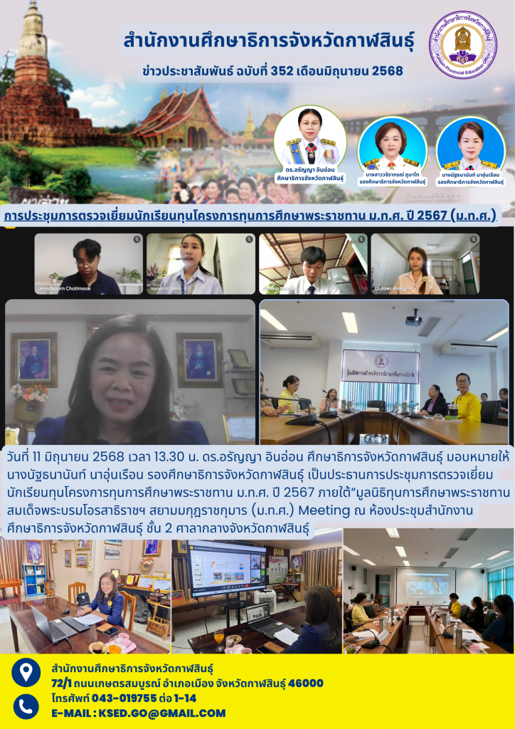 วันที่ 11 มิถุนายน 2568 เวลา 13.30 น. ดร.อรัญญา อินอ่อน ศึกษาธิการจังหวัดกาฬสินธุ์ มอบหมายให้ นางนัฐธนานันท์ นาอุ่นเรือน รองศึกษาธิการจังหวัดกาฬสินธุ์ เป็นประธานการประชุมการตรวจเยี่ยมนักเรียนทุนโครงการทุนการศึกษาพระราชทาน ม.ท.ศ. ปี 2567 ภายใต้“มูลนิธิทุนการศึกษาพระราชทานสมเด็จพระบรมโอรสาธิราชฯ สยามมกุฎราชกุมาร (ม.ท.ศ.) Meeting ณ ห้องประชุมสำนักงานศึกษาธิการจังหวัดกาฬสินธุ์ ชั้น 2 ศาลากลางจังหวัดกาฬสินธุ์
