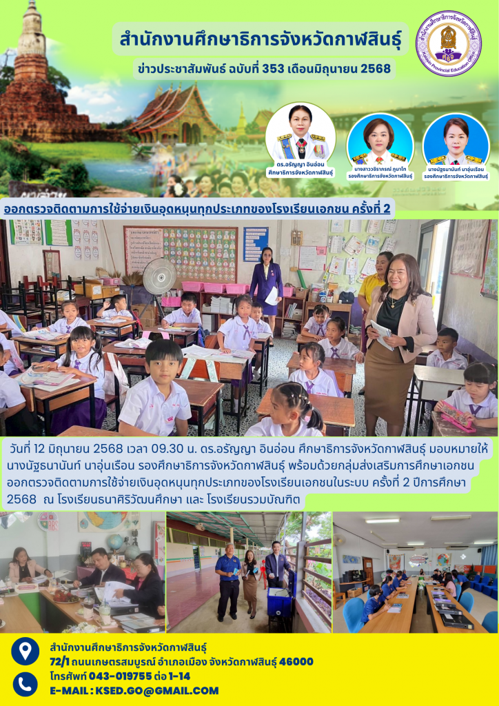 วันที่ 12 มิถุนายน 2568 เวลา 09.30 น. ดร.อรัญญา อินอ่อน ศึกษาธิการจังหวัดกาฬสินธุ์ มอบหมายให้ นางนัฐธนานันท์ นาอุ่นเรือน รองศึกษาธิการจังหวัดกาฬสินธุ์ พร้อมด้วยกลุ่มส่งเสริมการศึกษาเอกชน ออกตรวจติดตามการใช้จ่ายเงินอุดหนุนทุกประเภทของโรงเรียนเอกชนในระบบ ครั้งที่ 2 ปีการศึกษา 2568 ณ โรงเรียนธนาศิริวัฒนศึกษา และ โรงเรียนรวมบัณฑิต