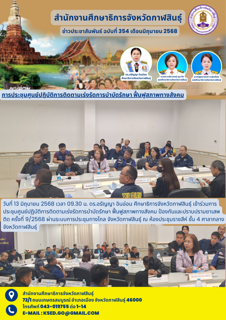 วันที่ 13 มิถุนายน 2568 เวลา 09.30 น. ดร.อรัญญา อินอ่อน ศึกษาธิการจังหวัดกาฬสินธุ์ เข้าร่วมการประชุมศูนย์ปฏิบัติการติดตามเร่งรัดการบำบัดรักษา ฟื้นฟูสภาพทางสังคม ป้องกันและปราบปรามยาเสพติด ครั้งที่ 9/2568 ผ่านระบบการประชุมทางไกล จังหวัดกาฬสินธุ์ ณ ห้องประชุมราชสีห์ ชั้น 4 ศาลากลางจังหวัดกาฬสินธุ์