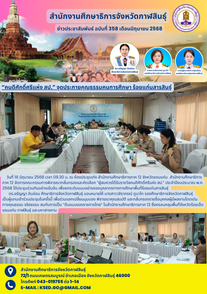 ดร.อรัญญา อินอ่อน ศึกษาธิการจังหวัดกาฬสินธุ์ มอบหมายให้ นางสาววชิราภรณ์ ภูนาโท รองศึกษาธิการจังหวัดกาฬสินธุ์ เป็นผู้แทนเข้าร่วมประชุมในครั้งนี้ เพื่อร่วมแลกเปลี่ยนมุมมอง พิจารณาคุณสมบัติ และกลั่นกรองรายชื่อบุคคลผู้มีผลงานโดดเด่นทางคุณธรรม จริยธรรม สมกับการเป็น “ต้นแบบของราชการไทย” ในสำนักงานศึกษาธิการภาค 12 ซึ่งครอบคลุมพื้นที่จังหวัดร้อยเอ็ด ขอนแก่น กาฬสินธุ์ และมหาสารคาม