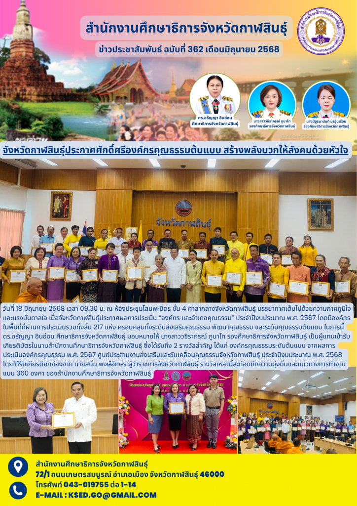 ในยุคที่สังคมต้องการต้นแบบแห่งความดี ความโปร่งใส และความรับผิดชอบ สำนักงานศึกษาธิการจังหวัดกาฬสินธุ์ ได้แสดงให้เห็นแล้วว่า “องค์กรภาครัฐสามารถเป็นพลังนำที่สร้างแรงบันดาลใจให้คนทั้งประเทศ”