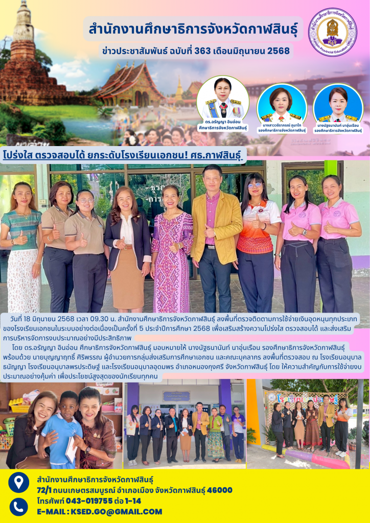 วันที่ 18 มิถุนายน 2568 เวลา 09.30 น. สำนักงานศึกษาธิการจังหวัดกาฬสินธุ์ ลงพื้นที่ตรวจติดตามการใช้จ่ายเงินอุดหนุนทุกประเภทของโรงเรียนเอกชนในระบบอย่างต่อเนื่องเป็นครั้งที่ 5 ประจำปีการศึกษา 2568 เพื่อเสริมสร้างความโปร่งใส ตรวจสอบได้ และส่งเสริมการบริหารจัดการงบประมาณอย่างมีประสิทธิภาพ
