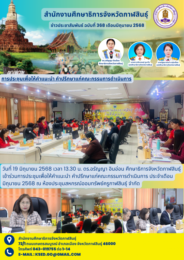 วันที่ 19 มิถุนายน 2568 เวลา 13.30 น. ดร.อรัญญา อินอ่อน ศึกษาธิการจังหวัดกาฬสินธุ์ เข้าร่วมการประชุมเพื่อให้คำแนะนำ คำปรึกษาแก่คณะกรรมการดำเนินการ ประจำเดือน มิถุนายน 2568