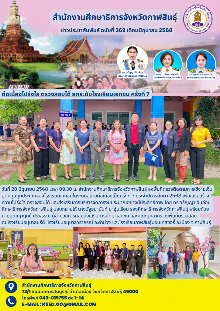 วันที่ 20 มิถุนายน 2568 เวลา 09.30 น. สำนักงานศึกษาธิการจังหวัดกาฬสินธุ์ ลงพื้นที่ตรวจติดตามการใช้จ่ายเงินอุดหนุนทุกประเภทของโรงเรียนเอกชนในระบบอย่างต่อเนื่องเป็นครั้งที่ 7 ประจำปีการศึกษา 2568 เพื่อเสริมสร้างความโปร่งใส ตรวจสอบได้ และส่งเสริมการบริหารจัดการงบประมาณอย่างมีประสิทธิภาพ โดย ดร.อรัญญา อินอ่อน ศึกษาธิการจังหวัดกาฬสินธุ์ มอบหมายให้ นางนัฐธนานันท์ นาอุ่นเรือน รองศึกษาธิการจังหวัดกาฬสินธุ์ พร้อมด้วย นายบุญญาฤทธิ์ ศิริพรรณ ผู้อำนวยการกลุ่มส่งเสริมการศึกษาเอกชน และคณะบุคลากร ลงพื้นที่ตรวจสอบ ณ โรงเรียนอนุบาลปรีดี โรงเรียนอนุบาลวราภรณ์ อ.คำม่วง และโรงเรียนกาฬสินธุ์มอนเทสซอรี่ อ.เมือง จ.กาฬสินธุ์