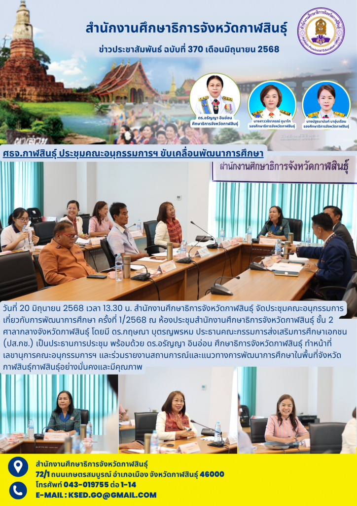 วันที่ 20 มิถุนายน 2568 เวลา 13.30 น. สำนักงานศึกษาธิการจังหวัดกาฬสินธุ์ จัดประชุมคณะอนุกรรมการเกี่ยวกับการพัฒนาการศึกษา ครั้งที่ 1/2568 ณ ห้องประชุมสำนักงานศึกษาธิการจังหวัดกาฬสินธุ์ ชั้น 2 ศาลากลางจังหวัดกาฬสินธุ์ โดยมี ดร.กฤษณา บุตรญพรหม ประธานคณะกรรมการส่งเสริมการศึกษาเอกชน (ปส.กช.) เป็นประธานการประชุม พร้อมด้วย ดร.อรัญญา อินอ่อน ศึกษาธิการจังหวัดกาฬสินธุ์ ทำหน้าที่เลขานุการคณะอนุกรรมการฯ และร่วมรายงานสถานการณ์และแนวทางการพัฒนาการศึกษาในพื้นที่จังหวัดกาฬสินธุ์กาฬสินธุ์อย่างมั่นคงและมีคุณภาพ