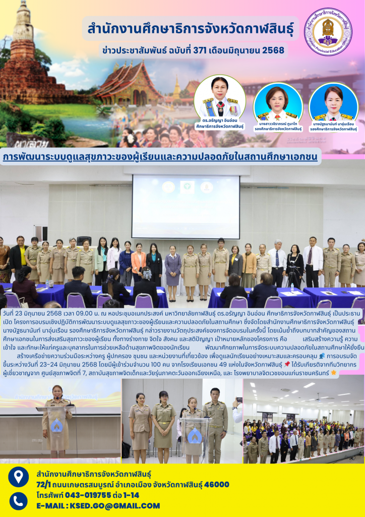 ดร.อรัญญา อินอ่อน ศึกษาธิการจังหวัดกาฬสินธุ์ เป็นประธานเปิด โครงการอบรมเชิงปฏิบัติการพัฒนาระบบดูแลสุขภาวะของผู้เรียนและความปลอดภัยในสถานศึกษา ซึ่งจัดโดย กลุ่มส่งเสริมการศึกษาเอกชน สำนักงานศึกษาธิการจังหวัดกาฬสินธุ์ 🧠💪