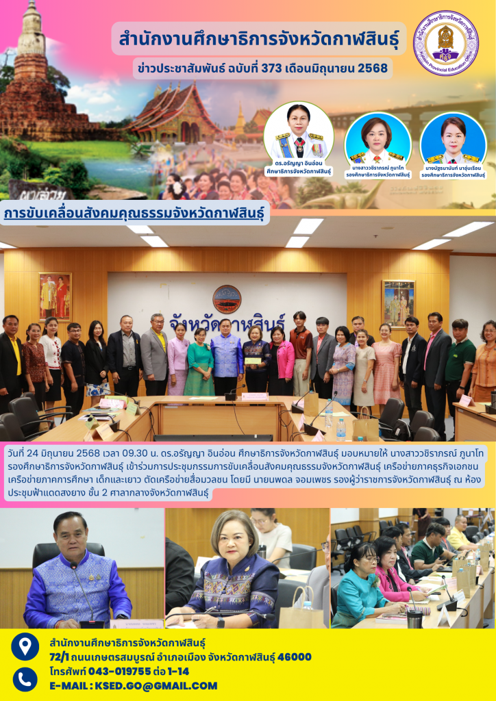 วันที่ 24 มิถุนายน 2568 เวลา 09.30 น. ดร.อรัญญา อินอ่อน ศึกษาธิการจังหวัดกาฬสินธุ์ มอบหมายให้ นางสาววชิราภรณ์ ภูนาโท รองศึกษาธิการจังหวัดกาฬสินธุ์ เข้าร่วมการประชุมกรรมการขับเคลื่อนสังคมคุณธรรมจังหวัดกาฬสินธุ์ เครือข่ายภาคธุรกิจเอกชนเครือข่ายภาคการศึกษา เด็กและเยาว ตัดเครือข่ายสื่อมวลชน โดยมี นายนพดล จอมเพชร รองผู้ว่าราชการจังหวัดกาฬสินธุ์ ณ ห้องประชุมฟ้าแดดสงยาง ชั้น 2 ศาลากลางจังหวัดกาฬสินธุ์