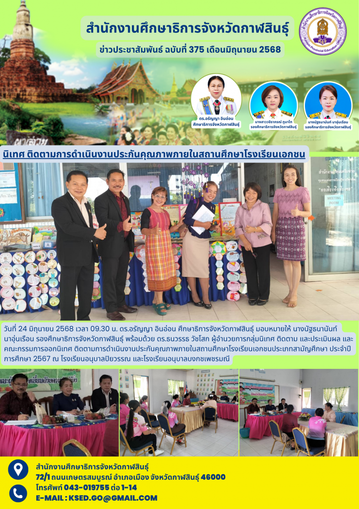 วันที่ 24 มิถุนายน 2568 เวลา 09.30 น. ดร.อรัญญา อินอ่อน ศึกษาธิการจังหวัดกาฬสินธุ์ มอบหมายให้ นางนัฐธนานันท์ นาอุ่นเรือน รองศึกษาธิการจังหวัดกาฬสินธุ์ พร้อมด้วย ดร.ธนวรรธ วัชโสก ผู้อำนวยการกลุ่มนิเทศ ติดตาม และประเมินผล และคณะกรรมการออกนิเทศ ติดตามการดำเนินงานประกันคุณภาพภายในสถานศึกษาโรงเรียนเอกชนประเภทสามัญศึกษา ประจำปีการศึกษา 2567 ณ โรงเรียนอนุบาลปิยวรรณ และโรงเรียนอนุบาลบงกชเพชรมณี