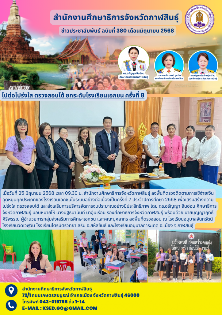 เมื่อวันที่ 25 มิถุนายน 2568 เวลา 09.30 น. สำนักงานศึกษาธิการจังหวัดกาฬสินธุ์ ลงพื้นที่ตรวจติดตามการใช้จ่ายเงินอุดหนุนทุกประเภทของโรงเรียนเอกชนในระบบอย่างต่อเนื่องเป็นครั้งที่ 7 ประจำปีการศึกษา 2568 เพื่อเสริมสร้างความโปร่งใส ตรวจสอบได้ และส่งเสริมการบริหารจัดการงบประมาณอย่างมีประสิทธิภาพ โดย ดร.อรัญญา อินอ่อน ศึกษาธิการจังหวัดกาฬสินธุ์ มอบหมายให้ นางนัฐธนานันท์ นาอุ่นเรือน รองศึกษาธิการจังหวัดกาฬสินธุ์ พร้อมด้วย นายบุญญาฤทธิ์ ศิริพรรณ ผู้อำนวยการกลุ่มส่งเสริมการศึกษาเอกชน และคณะบุคลากร ลงพื้นที่ตรวจสอบ ณ โรงเรียนอนุบาลจันทรัตน์ โรงเรียนวัดเวฬุวัน โรงเรียนไตรมิตรวิทยาเสริม อ.สหัสขันธ์ และโรงเรียนอนุบาลการะเกด อ.เมือง จ.กาฬสินธุ์