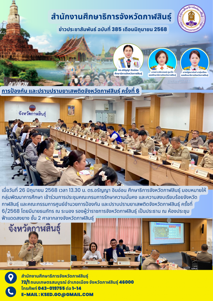 เมื่อวันที่ 26 มิถุนายน 2568 เวลา 13.30 น. ดร.อรัญญา อินอ่อน ศึกษาธิการจังหวัดกาฬสินธุ์ มอบหมายให้กลุ่มพัฒนาการศึกษา เข้าร่วมการประชุมคณะกรมการรักษาความมั่นคง และความสงบเรียบร้อยจังหวัดกาฬสินธุ์ และคณะกรรมการศูนย์อำนวยการป้องกัน และปราบปรามยาเสพติดจังหวัดกาฬสินธุ์ ครั้งที่ 6/2568 โดยมีนายธนภัทร ณ ระนอง รองผู้ว่าราชการจังหวัดกาฬสินธุ์ เป็นประธาน ณ ห้องประชุมฟ้าแดดสงยาง ชั้น 2 ศาลากลางจังหวัดกาฬสินธุ์