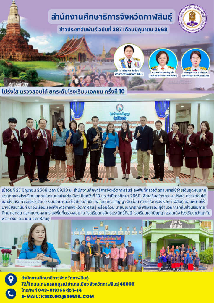 เมื่อวันที่ 27 มิถุนายน 2568 เวลา 09.30 น. สำนักงานศึกษาธิการจังหวัดกาฬสินธุ์ ลงพื้นที่ตรวจติดตามการใช้จ่ายเงินอุดหนุนทุกประเภทของโรงเรียนเอกชนในระบบอย่างต่อเนื่องเป็นครั้งที่ 10 ประจำปีการศึกษา 2568 เพื่อเสริมสร้างความโปร่งใส ตรวจสอบได้ และส่งเสริมการบริหารจัดการงบประมาณอย่างมีประสิทธิภาพ โดย ดร.อรัญญา อินอ่อน ศึกษาธิการจังหวัดกาฬสินธุ์ มอบหมายให้ นางนัฐธนานันท์ นาอุ่นเรือน รองศึกษาธิการจังหวัดกาฬสินธุ์ พร้อมด้วย นายบุญญาฤทธิ์ ศิริพรรณ ผู้อำนวยการกลุ่มส่งเสริมการศึกษาเอกชน และคณะบุคลากร ลงพื้นที่ตรวจสอบ ณ โรงเรียนคุรุมิตรประสิทธิ์ศิลป์ โรงเรียนเอกปัญญา อ.สมเด็จ โรงเรียนขวัญฤทัยพัฒนวิชช์ อ.นามน จ.กาฬสินธุ์