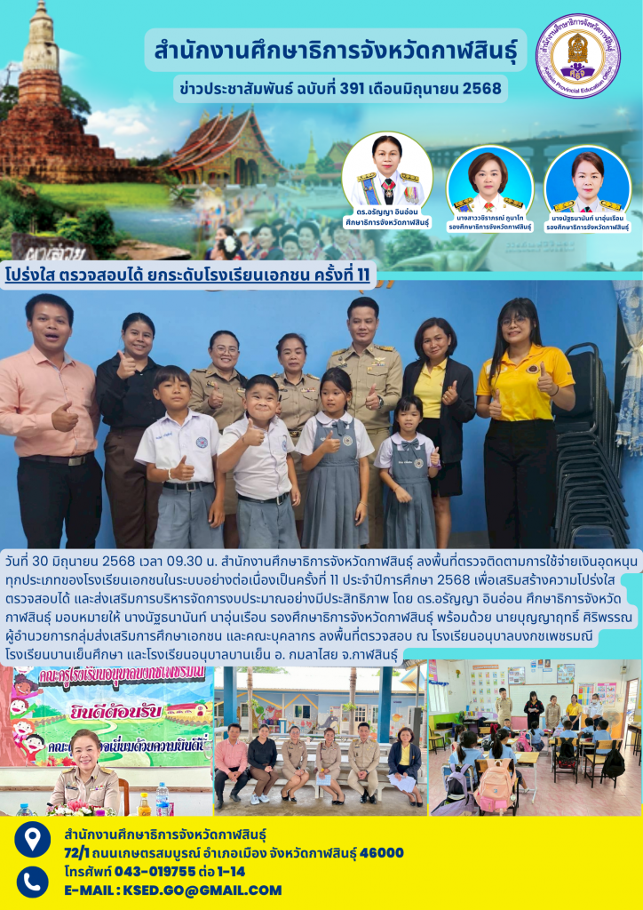 วันที่ 30 มิถุนายน 2568 เวลา 09.30 น. สำนักงานศึกษาธิการจังหวัดกาฬสินธุ์ ลงพื้นที่ตรวจติดตามการใช้จ่ายเงินอุดหนุนทุกประเภทของโรงเรียนเอกชนในระบบอย่างต่อเนื่องเป็นครั้งที่ 11 ประจำปีการศึกษา 2568 เพื่อเสริมสร้างความโปร่งใส ตรวจสอบได้ และส่งเสริมการบริหารจัดการงบประมาณอย่างมีประสิทธิภาพ โดย ดร.อรัญญา อินอ่อน ศึกษาธิการจังหวัดกาฬสินธุ์ มอบหมายให้ นางนัฐธนานันท์ นาอุ่นเรือน รองศึกษาธิการจังหวัดกาฬสินธุ์ พร้อมด้วย นายบุญญาฤทธิ์ ศิริพรรณ ผู้อำนวยการกลุ่มส่งเสริมการศึกษาเอกชน และคณะบุคลากร ลงพื้นที่ตรวจสอบ ณ โรงเรียนอนุบาลบงกชเพชรมณี โรงเรียนบานเย็นศึกษา และโรงเรียนอนุบาลบานเย็น อ. กมลาไสย จ.กาฬสินธุ์