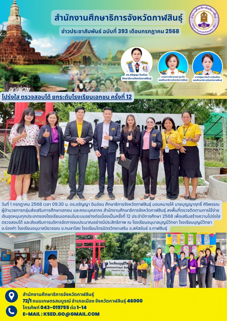 วันที่ 1 กรกฎาคม 2568 เวลา 09.30 น. ดร.อรัญญา อินอ่อน ศึกษาธิการจังหวัดกาฬสินธุ์ มอบหมายให้ นายบุญญาฤทธิ์ ศิริพรรณ ผู้อำนวยการกลุ่มส่งเสริมการศึกษาเอกชน และคณะบุคลากร สำนักงานศึกษาธิการจังหวัดกาฬสินธุ์ ลงพื้นที่ตรวจติดตามการใช้จ่ายเงินอุดหนุนทุกประเภทของโรงเรียนเอกชนในระบบอย่างต่อเนื่องเป็นครั้งที่ 12 ประจำปีการศึกษา 2568 เพื่อเสริมสร้างความโปร่งใส ตรวจสอบได้ และส่งเสริมการบริหารจัดการงบประมาณอย่างมีประสิทธิภาพ ณ โรงเรียนอนุบาลบุญมีวิทยา โรงเรียนบุญมีวิทยา อ.ร่องคำ โรงเรียนอนุบาลปิยวรรณ อ.กมลาไสย โรงเรียนไตรมิตรวิทยาเสริม อ.สหัสขันธ์ จ.กาฬสินธุ์