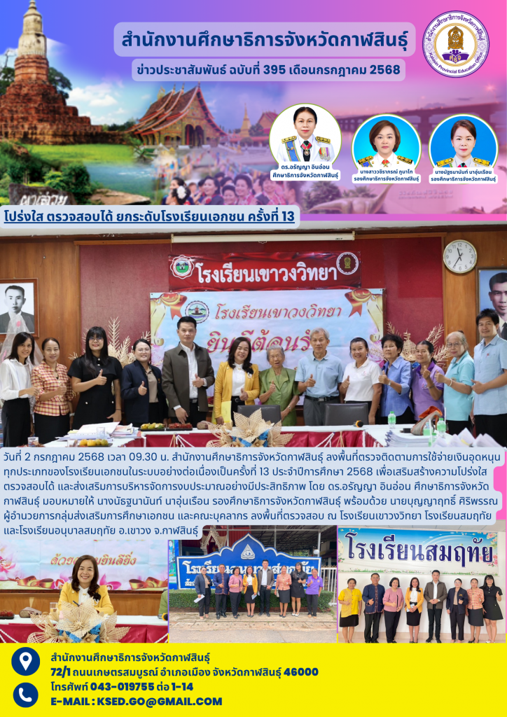 วันที่ 2 กรกฎาคม 2568 เวลา 09.30 น. สำนักงานศึกษาธิการจังหวัดกาฬสินธุ์ ลงพื้นที่ตรวจติดตามการใช้จ่ายเงินอุดหนุนทุกประเภทของโรงเรียนเอกชนในระบบอย่างต่อเนื่องเป็นครั้งที่ 13 ประจำปีการศึกษา 2568 เพื่อเสริมสร้างความโปร่งใส ตรวจสอบได้ และส่งเสริมการบริหารจัดการงบประมาณอย่างมีประสิทธิภาพ โดย ดร.อรัญญา อินอ่อน ศึกษาธิการจังหวัดกาฬสินธุ์ มอบหมายให้ นางนัธฐนานันท์ นาอุ่นเรือน รองศึกษาธิการจังหวัดกาฬสินธุ์ พร้อมด้วย นายบุญญาฤทธิ์ ศิริพรรณ ผู้อำนวยการกลุ่มส่งเสริมการศึกษาเอกชน และคณะบุคลากร ลงพื้นที่ตรวจสอบ ณ โรงเรียนเขาวงวิทยา โรงเรียนสมฤทัย และโรงเรียนอนุบาลสมฤทัย อ.เขาวง จ.กาฬสินธุ์