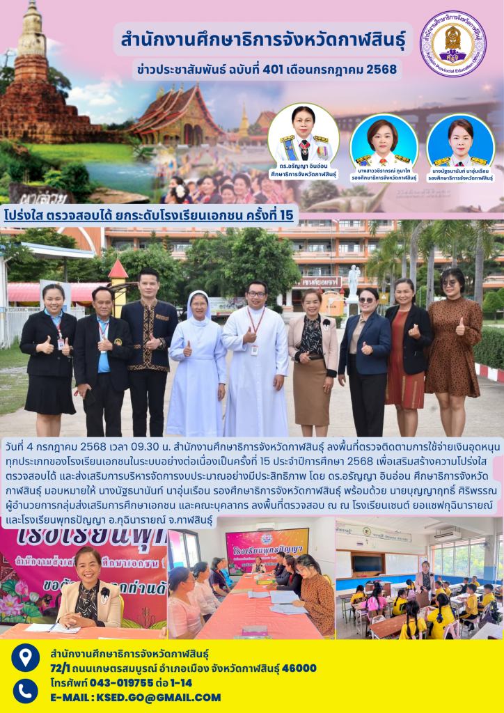 วันที่ 4 กรกฎาคม 2568 เวลา 09.30 น. สำนักงานศึกษาธิการจังหวัดกาฬสินธุ์ ลงพื้นที่ตรวจติดตามการใช้จ่ายเงินอุดหนุนทุกประเภทของโรงเรียนเอกชนในระบบอย่างต่อเนื่องเป็นครั้งที่ 15 ประจำปีการศึกษา 2568 เพื่อเสริมสร้างความโปร่งใส ตรวจสอบได้ และส่งเสริมการบริหารจัดการงบประมาณอย่างมีประสิทธิภาพ โดย ดร.อรัญญา อินอ่อน ศึกษาธิการจังหวัดกาฬสินธุ์ มอบหมายให้ นางนัฐธนานันท์ นาอุ่นเรือน รองศึกษาธิการจังหวัดกาฬสินธุ์ พร้อมด้วย นายบุญญาฤทธิ์ ศิริพรรณ ผู้อำนวยการกลุ่มส่งเสริมการศึกษาเอกชน และคณะบุคลากร ลงพื้นที่ตรวจสอบ ณ ณ โรงเรียนเซนต์ ยอแซฟกุฉินารายณ์ และโรงเรียนพุทธปัญญา อ.กุฉินารายณ์ จ.กาฬสินธุ์