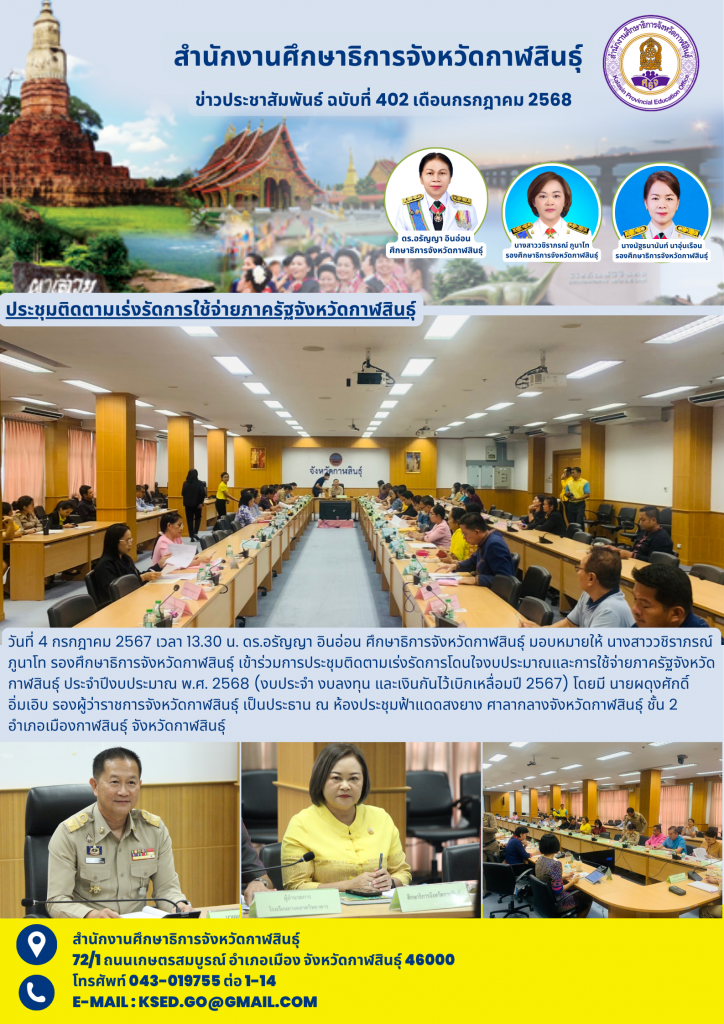 วันที่ 4 กรกฎาคม 2567 เวลา 13.30 น. ดร.อรัญญา อินอ่อน ศึกษาธิการจังหวัดกาฬสินธุ์ มอบหมายให้ นางสาววชิราภรณ์ ภูนาโท รองศึกษาธิการจังหวัดกาฬสินธุ์ เข้าร่วมการประชุมติดตามเร่งรัดการโดนใจงบประมาณและการใช้จ่ายภาครัฐจังหวัดกาฬสินธุ์ ประจำปีงบประมาณ พ.ศ. 2568 (งบประจำ งบลงทุน และเงินกันไว้เบิกเหลื่อมปี 2567) โดยมี นายผดุงศักดิ์ อิ่มเอิบ รองผู้ว่าราชการจังหวัดกาฬสินธุ์ เป็นประธาน ณ ห้องประชุมฟ้าแดดสงยาง ศาลากลางจังหวัดกาฬสินธุ์ ชั้น 2 อำเภอเมืองกาฬสินธุ์ จังหวัดกาฬสินธุ์