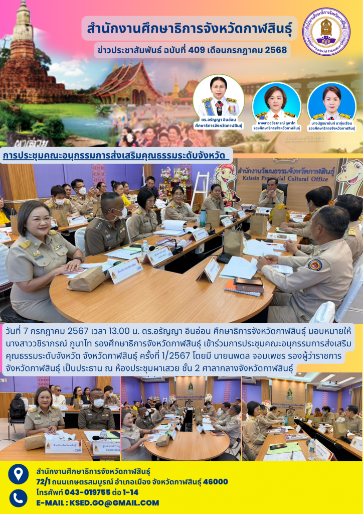 วันที่ 7 กรกฎาคม 2567 เวลา 13.00 น. ดร.อรัญญา อินอ่อน ศึกษาธิการจังหวัดกาฬสินธุ์ มอบหมายให้ นางสาววชิราภรณ์ ภูนาโท รองศึกษาธิการจังหวัดกาฬสินธุ์ เข้าร่วมการประชุมคณะอนุกรรมการส่งเสริมคุณธรรมระดับจังหวัด จังหวัดกาฬสินธุ์ ครั้งที่ 1/2567 โดยมี นายนพดล จอมเพชร รองผู้ว่าราชการจังหวัดกาฬสินธุ์ เป็นประธาน ณ ห้องประชุมผาเสวย ชั้น 2 ศาลากลางจังหวัดกาฬสินธุ์