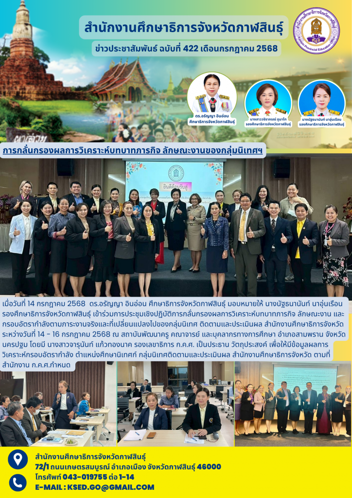 เมื่อวันที่ 14 กรกฎาคม 2568 ดร.อรัญญา อินอ่อน ศึกษาธิการจังหวัดกาฬสินธุ์ มอบหมายให้ นางนัฐธนานันท์ นาอุ่นเรือน รองศึกษาธิการจังหวัดกาฬสินธุ์ เข้าร่วมการประชุมเชิงปฏิบัติการกลั่นกรองผลการวิเคราะห์บทบาทภารกิจ ลักษณะงาน และกรอบอัตรากำลังตามภาระงานจริงและที่เปลี่ยนแปลงไปของกลุ่มนิเทศ ติดตามและประเมินผล สำนักงานศึกษาธิการจังหวัด ระหว่างวันที่ 14 – 16 กรกฎาคม 2568 ณ สถาบันพัฒนาครู คณาจารย์ และบุคลากรทางการศึกษา อำเภอสามพราน จังหวัดนครปฐม โดยมี นางสาวจารุนันท์ แก้วทองนาค รองเลขาธิการ ก.ค.ศ. เป็นประธาน วัตถุประสงค์ เพื่อให้มีข้อมูลผลการวิเคราะห์กรอบอัตรากำลัง ตำแหน่งศึกษานิเทศก์ กลุ่มนิเทศติดตามและประเมินผล สำนักงานศึกษาธิการจังหวัด ตามที่สำนักงาน ก.ค.ศ.กำหนด