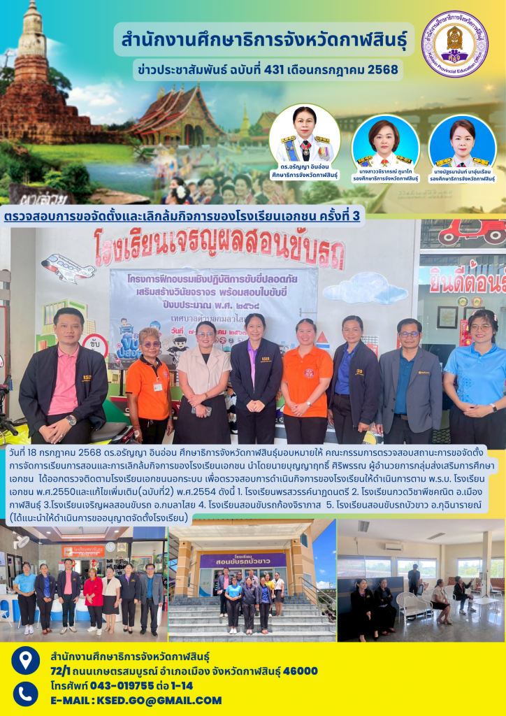 วันที่ 18 กรกฎาคม 2568 ดร.อรัญญา อินอ่อน ศึกษาธิการจังหวัดกาฬสินธุ์มอบหมายให้ คณะกรรมการตรวจสอบสถานะการขอจัดตั้งการจัดการเรียนการสอนและการเลิกล้มกิจการของโรงเรียนเอกชน นำโดยนายบุญญาฤทธิ์ ศิริพรรณ ผู้อำนวยการกลุ่มส่งเสริมการศึกษาเอกชน ได้ออกตรวจติดตามโรงเรียนเอกชนนอกระบบ เพื่อตรวจสอบการดำเนินกิจการของโรงเรียนให้ดำเนินการตาม พ.ร.บ. โรงเรียนเอกชน พ.ศ.2550และแก้ไขเพิ่มเติม(ฉบับที่2) พ.ศ.2554 ดังนี้