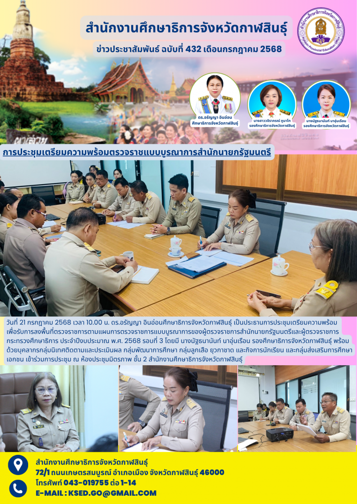 วันที่ 21 กรกฎาคม 2568 เวลา 10.00 น. ดร.อรัญญา อินอ่อนศึกษาธิการจังหวัดกาฬสินธุ์ เป็นประธานการประชุมเตรียมความพร้อม เพื่อรับการลงพื้นที่ตรวจราชการตามแผนการตรวจราชการแบบบูรณาการของผู้ตรวจราชการสำนักนายกรัฐมนตรีและผู้ตรวจราชการกระทรวงศึกษาธิการ ประจำปีงบประมาณ พ.ศ. 2568 รอบที่ 3 โดยมี นางนัฐธนานันท์ นาอุ่นเรือน รองศึกษาธิการจังหวัดกาฬสินธุ์ พร้อมด้วยบุคลากรกลุ่มนิเทศติดตามและประเมินผล กลุ่มพัฒนาการศึกษา กลุ่มลูกเสือ ยุวกาชาด และกิจการนักเรียน และกลุ่มส่งเสริมการศึกษาเอกชน เข้าร่วมการประชุม ณ ห้องประชุมมิตรภาพ ชั้น 2 สำนักงานศึกษาธิการจังหวัดกาฬสินธุ์