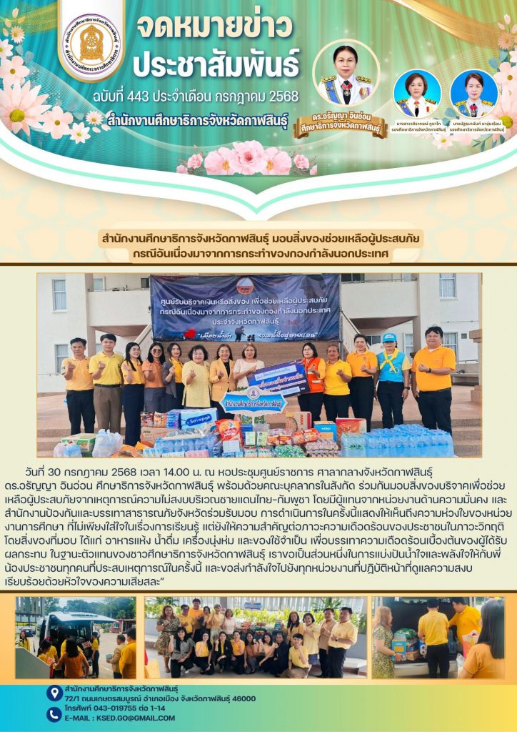 ดร.อรัญญา อินอ่อน ศึกษาธิการจังหวัดกาฬสินธุ์ พร้อมด้วยคณะบุคลากรในสังกัด ร่วมกันมอบสิ่งของบริจาคเพื่อช่วยเหลือผู้ประสบภัยจากเหตุการณ์ความไม่สงบบริเวณชายแดนไทย–กัมพูชา โดยมีผู้แทนจากหน่วยงานด้านความมั่นคง และสำนักงานป้องกันและบรรเทาสาธารณภัยจังหวัดร่วมรับมอบ การดำเนินการในครั้งนี้แสดงให้เห็นถึงความห่วงใยของหน่วยงานการศึกษา ที่ไม่เพียงใส่ใจในเรื่องการเรียนรู้ แต่ยังให้ความสำคัญต่อภาวะความเดือดร้อนของประชาชนในภาวะวิกฤติ โดยสิ่งของที่มอบ ได้แก่ อาหารแห้ง น้ำดื่ม เครื่องนุ่งห่ม และของใช้จำเป็น เพื่อบรรเทาความเดือดร้อนเบื้องต้นของผู้ได้รับผลกระทบ ในฐานะตัวแทนของชาวศึกษาธิการจังหวัดกาฬสินธุ์ เราขอเป็นส่วนหนึ่งในการแบ่งปันน้ำใจและพลังใจให้กับพี่น้องประชาชนทุกคนที่ประสบเหตุการณ์ในครั้งนี้ และขอส่งกำลังใจไปยังทุกหน่วยงานที่ปฏิบัติหน้าที่ดูแลความสงบเรียบร้อยด้วยหัวใจของความเสียสละ”