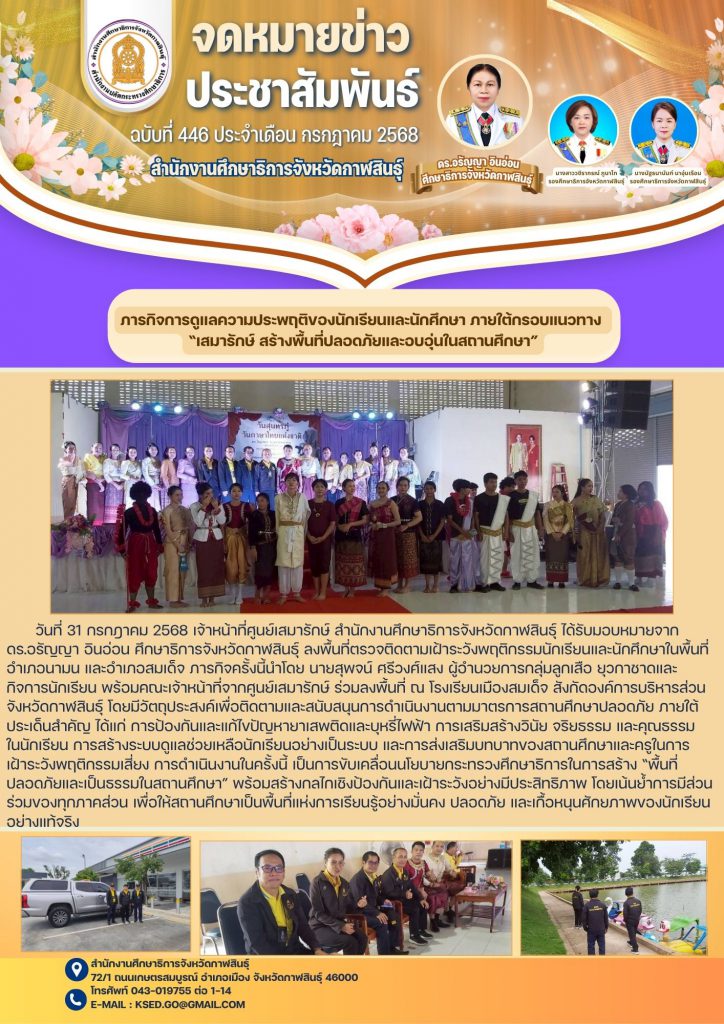 อำเภอนามน และอำเภอสมเด็จ ภารกิจครั้งนี้นำโดย นายสุพจน์ ศรีวงศ์แสง ผู้อำนวยการกลุ่มลูกเสือ ยุวกาชาดและกิจการนักเรียน พร้อมคณะเจ้าหน้าที่จากศูนย์เสมารักษ์ ร่วมลงพื้นที่ ณ โรงเรียนเมืองสมเด็จ สังกัดองค์การบริหารส่วนจังหวัดกาฬสินธุ์ โดยมีวัตถุประสงค์เพื่อติดตามและสนับสนุนการดำเนินงานตามมาตรการสถานศึกษาปลอดภัย ภายใต้ประเด็นสำคัญ ได้แก่ การป้องกันและแก้ไขปัญหายาเสพติดและบุหรี่ไฟฟ้า การเสริมสร้างวินัย จริยธรรม และคุณธรรม ในนักเรียน การสร้างระบบดูแลช่วยเหลือนักเรียนอย่างเป็นระบบ และการส่งเสริมบทบาทของสถานศึกษาและครูในการ เฝ้าระวังพฤติกรรมเสี่ยง การดำเนินงานในครั้งนี้ เป็นการขับเคลื่อนนโยบายกระทรวงศึกษาธิการในการสร้าง “พื้นที่ปลอดภัยและเป็นธรรมในสถานศึกษา” พร้อมสร้างกลไกเชิงป้องกันและเฝ้าระวังอย่างมีประสิทธิภาพ โดยเน้นย้ำการมีส่วนร่วมของทุกภาคส่วน เพื่อให้สถานศึกษาเป็นพื้นที่แห่งการเรียนรู้อย่างมั่นคง ปลอดภัย และเกื้อหนุนศักยภาพของนักเรียนอย่างแท้จริง