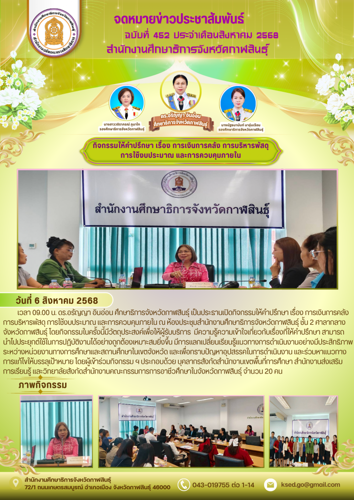 วันที่ 6 สิงหาคม 2568 เวลา 09.00 น. ดร.อรัญญา อินอ่อน ศึกษาธิการจังหวัดกาฬสินธุ์ เป็นประธานเปิดกิจกรรมให้คำปรึกษา เรื่อง การเงินการคลัง การบริหารพัสดุ การใช้งบประมาณ และการควบคุมภายใน ณ ห้องประชุมสำนักงานศึกษาธิการจังหวัดกาฬสินธุ์ ชั้น 2 ศาลากลางจังหวัดกาฬสินธุ์ โดยกิจกรรมในครั้งนี้มีวัตถุประสงค์เพื่อให้ผู้รับบริการ มีความรู้ความเข้าใจเกี่ยวกับเรื่องที่ให้คำปรึกษา สามารถนำไปประยุกต์ใช้ในการปฏิบัติงานได้อย่างถูกต้องเหมาะสมยิ่งขึ้น มีการแลกเปลี่ยนเรียนรู้แนวทางการดำเนินงานอย่างมีประสิทธิภาพ ระหว่างหน่วยงานทางการศึกษาและสถานศึกษาในเขตจังหวัด และเพื่อทราบปัญหาอุปสรรคในการดำเนินงาน และร่วมหาแนวทางการแก้ไขให้บรรลุเป้าหมาย โดยผู้เข้าร่วมกิจกรรม ฯ ประกอบด้วย บุคลากรสังกัดสำนักงานเขตพื้นที่การศึกษา สำนักงานส่งเสริมการเรียนรู้ และวิทยาลัยสังกัดสำนักงานคณะกรรมการการอาชีวศึกษาในจังหวัดกาฬสินธุ์ จำนวน 20 คน