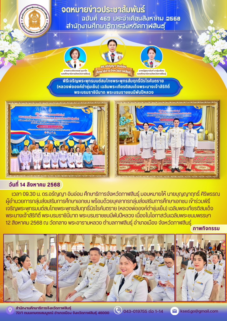 วันที่ 14 สิงหาคม 2568 เวลา 09.30 น. ดร.อรัญญา อินอ่อน ศึกษาธิการจังหวัดกาฬสินธุ์ มอบหมายให้ นายบุญญาฤทธิ์ ศิริพรรณ ผู้อำนวยการกลุ่มส่งเสริมการศึกษาเอกชน พร้อมด้วยบุคลากรกลุ่มส่งเสริมการศึกษาเอกชน เข้าร่วมพิธี