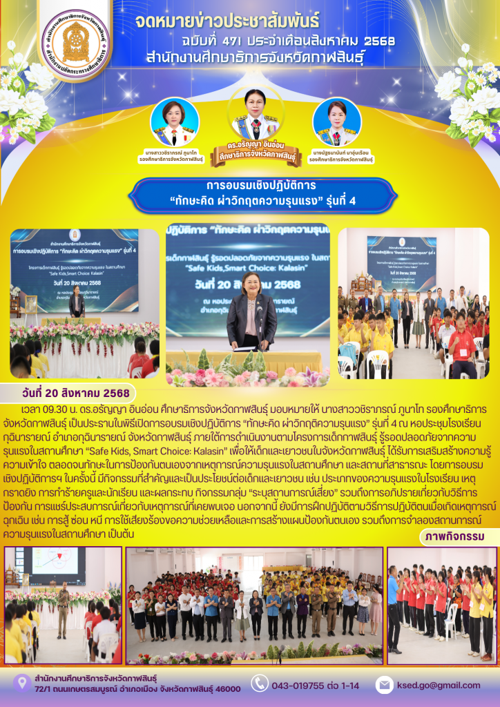 วันที่ 20 สิงหาคม 2568 เวลา 09.30 น. ดร.อรัญญา อินอ่อน ศึกษาธิการจังหวัดกาฬสินธุ์ มอบหมายให้ นางสาววชิราภรณ์ ภูนาโท รองศึกษาธิการจังหวัดกาฬสินธุ์ เป็นประธานในพิธีเปิดการอบรมเชิงปฏิบัติการ “ทักษะคิด ผ่าวิกฤติความรุนแรง” รุ่นที่ 4 ณ หอประชุมโรงเรียนกุฉินารายณ์ อำเภอกุฉินารายณ์ จังหวัดกาฬสินธุ์ ภายใต้การดำเนินงานตามโครงการเด็กกาฬสินธุ์ รู้รอดปลอดภัยจากความรุนแรงในสถานศึกษา “Safe Kids, Smart Choice: Kalasin” เพื่อให้เด็กและเยาวชนในจังหวัดกาฬสินธุ์ ได้รับการเสริมสร้างความรู้ความเข้าใจ ตลอดจนทักษะในการป้องกันตนเองจากเหตุการณ์ความรุนแรงในสถานศึกษา และสถานที่สาธารณะ โดยการอบรมเชิงปฏิบัติการฯ ในครั้งนี้ มีกิจกรรมที่สำคัญและเป็นประโยชน์ต่อเด็กและเยาวชน เช่น ประเภทของความรุนแรงในโรงเรียน เหตุกราดยิง การทำร้ายครูและนักเรียน และผลกระทบ กิจกรรมกลุ่ม “ระบุสถานการณ์เสี่ยง” รวมถึงการอภิปรายเกี่ยวกับวิธีการป้องกัน การแชร์ประสบการณ์เกี่ยวกับเหตุการณ์ที่เคยพบเจอ นอกจากนี้ ยังมีการฝึกปฏิบัติตามวิธีการปฏิบัติตนเมื่อเกิดเหตุการณ์ฉุกเฉิน เช่น การสู้ ซ่อน หนี การใช้เสียงร้องขอความช่วยเหลือและการสร้างแผนป้องกันตนเอง รวมถึงการจำลองสถานการณ์ความรุนแรงในสถานศึกษา เป็นต้น