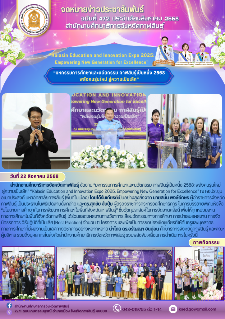 วันที่ 22 สิงหาคม 2568 สำนักงานศึกษาธิการจังหวัดกาฬสินธุ์ จัดงาน “มหกรรมการศึกษาและนวัตกรรม กาฬสินธุ์เป็นหนึ่ง 2568: พลังคนรุ่นใหม่สู่ความเป็นเลิศ” “Kalasin Education and Innovation Expo 2025: Empowering New Generation for Excellence” ณ หอประชุมอเนกประสงค์ มหาวิทยาลัยกาฬสินธุ์ (พื้นที่ในเมือง) โดยได้รับเกียรติเป็นอย่างสูงยิ่งจาก นายสนั่น พงษ์อักษร ผู้ว่าราชการจังหวัดกาฬสินธุ์ เป็นประธานในพิธีเปิดงานดังกล่าว และดร.สุภชัย จันปุ่ม ผู้ตรวจราชการกระทรวงศึกษาธิการ ในการบรรยายพิเศษหัวข้อ “นโยบายการศึกษากับการพัฒนาการศึกษาในพื้นที่จังหวัดกาฬสินธุ์” ซึ่งวัตถุประสงค์ในการจัดงานครั้งนี้ เพื่อให้ทุกหน่วยงานทางการศึกษาในพื้นที่จังหวัดกาฬสินธุ์ ได้ร่วมแสดงผลงานทางวิชาการ สื่อนวัตกรรมทางการศึกษา การนำเสนอผลงาน การจัดนิทรรศการ วิธีปฏิบัติที่เป็นเลิศ (Best Practice) จำนวน 11 โครงการ และเพื่อเป็นการยกย่องเชิดชูเกียรติให้กับครูและบุคลากรทางการศึกษาที่มีผลงานเป็นเลิศทางวิชาการอย่างหลากหลาย นำโดย ดร.อรัญญา อินอ่อน ศึกษาธิการจังหวัดกาฬสินธุ์ และคณะผู้บริหาร รวมถึงบุคลากรในสังกัดสำนักงานศึกษาธิการจังหวัดกาฬสินธุ์ รวมพลังขับเคลื่อนการดำเนินการในครั้งนี้ https://www.facebook.com/share/p/17BD4K6uC4/