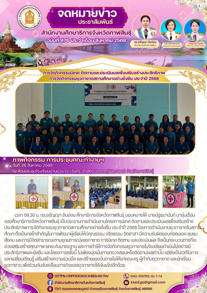 วันที่ 26 สิงหาคม 2568 เวลา 09.30 น. ดร.อรัญญา อินอ่อน ศึกษาธิการจังหวัดกาฬสินธุ์ มอบหมายให้ นางนัฐธนานันท์ นาอุ่นเรือนรองศึกษาธิการจังหวัดกาฬสินธุ์ เป็นประธานการดำเนินงานโครงการนิเทศ ติดตามและประเมินผลเพื่อเสริมสร้างประสิทธิภาพการจัดกิจกรรมยุวกาชาดสถานศึกษาอย่างยั่งยืน ประจำปี 2568 ณ ห้องประชุมโรงเรียนบ้านบัวขาว (วันครู 2500) อำเภอกุฉินารายณ์ จังหวัดกาฬสินธุ์ โดยการดำเนินงานยุวกาชาดในสถานศึกษา ถือเป็นกลไกสำคัญในการพัฒนาผู้เรียนให้มีคุณธรรม จริยธรรม จิตอาสา มีความรับผิดชอบต่อตนเอง ชุมชน สังคม และการมีจิตสาธารณะตามอุดมการณ์ของกาชาด การนิเทศ ติดตาม และประเมินผล จึงเป็นกระบวนการที่จะช่วยเสริมสร้างคุณภาพ ยกระดับมาตรฐาน และการทำให้การจัดกิจกรรมยุวกาชาดในโรงเรียนดำเนินไปอย่างมีประสิทธิภาพและยั่งยืน และโครงการครั้งนี้ ไม่เพียงมุ่งเน้นการตรวจสอบหรือติดตามผลเท่านั้น แต่ยังเป็นเวทีในการแลกเปลี่ยนเรียนรู้ เสริมสร้างความร่วมมือ และสร้างแรงบันดาลใจให้แก่คณะครู ผู้กำกับยุวกาชาด และนักเรียนยุวกาชาด เพื่อร่วมกันขับเคลื่อนภารกิจของยุวกาชาดให้เข้มแข็งอีกด้วย
