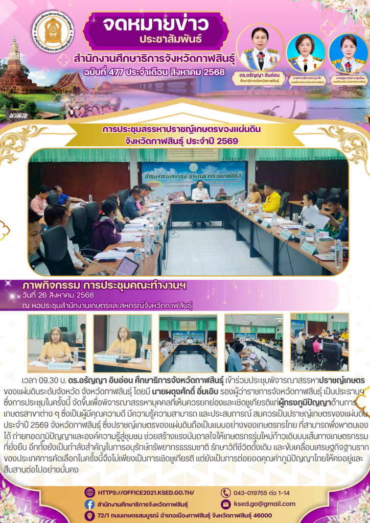 วันที่ 26 สิงหาคม 2568 เวลา 09.30 น. ดร.อรัญญา อินอ่อน ศึกษาธิการจังหวัดกาฬสินธุ์ เข้าร่วมประชุมพิจารณาสรรหาปราชญ์เกษตร ของแผ่นดินระดับจังหวัด จังหวัดกาฬสินธุ์ ณ หอประชุมสำนักงานเกษตรและสหกรณ์จังหวัดกาฬสินธุ์ โดยมี นายผดุงศักดิ์ อิ่มเอิบ รองผู้ว่าราชการจังหวัดกาฬสินธุ์ เป็นประธานฯ การประชุมในครั้งนี้ จัดขึ้นเพื่อพิจารณาสรรหาบุคคลที่เห็นควรยกย่องและเชิดชูเกียรติแก่ผู้ทรงภูมิปัญญาด้านการเกษตรสาขาต่าง ๆ ซึ่งเป็นผู้มีคุณความดี มีความรู้ความสามารถ และประสบการณ์ สมควรเป็นปราชญ์เกษตรของแผ่นดิน ประจำปี 2569 จังหวัดกาฬสินธุ์ และปราชญ์เกษตรของแผ่นดินถือเป็นแบบอย่างของเกษตรกรไทย ที่สามารถพึ่งพาตนเองได้ ถ่ายทอดภูมิปัญญาและองค์ความรู้สู่ชุมชน ช่วยสร้างแรงบันดาลใจให้เกษตรกรรุ่นใหม่ก้าวเดินบนเส้นทางเกษตรกรรมที่ยั่งยืน อีกทั้งยังเป็นกำลังสำคัญในการอนุรักษ์ทรัพยากรธรรมชาติ รักษาวิถีชีวิตดั้งเดิม และขับเคลื่อนเศรษฐกิจฐานรากของประเทศการคัดเลือกในครั้งนี้จึงไม่เพียงเป็นการเชิดชูเกียรติ แต่ยังเป็นการต่อยอดคุณค่าภูมิปัญญาไทยให้คงอยู่และสืบสานต่อไปอย่างมั่นคง