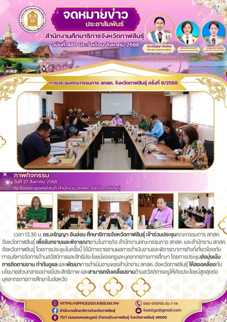 วันที่ 27 สิงหาคม 2568 เวลา 13.30 น. ดร.อรัญญา อินอ่อน ศึกษาธิการจังหวัดกาฬสินธุ์ เข้าร่วมประชุมคณะกรรมการ สกสค. จังหวัดกาฬสินธุ์ ณ ห้องประชุมพฤหัสบดี สำนักงาน สกสค. จังหวัดกาฬสินธุ์ เพื่อรับทราบและพิจารณางานในภารกิจ สำนักงานคณะกรรมการ สกสค. และสำนักงาน สกสค. จังหวัดกาฬสินธุ์ โดยการประชุมในครั้งนี้ ได้มีการรายงานผลการดำเนินงานและพิจารณาภารกิจที่เกี่ยวข้องกับการบริหารจัดการด้านสวัสดิการและสิทธิประโยชน์ของครูและบุคลากรทางการศึกษา โดยการประชุมยังมุ่งเน้นการติดตามงาน กำกับดูแล และพัฒนาการดำเนินงานของสำนักงาน สกสค. จังหวัดกาฬสินธุ์ ให้สอดคล้องกับนโยบายส่วนกลางอย่างมีประสิทธิภาพ และสามารถขับเคลื่อนงานด้านสวัสดิการครูให้เกิดประโยชน์สูงสุดต่อบุคลากรทางการศึกษาในจังหวัด