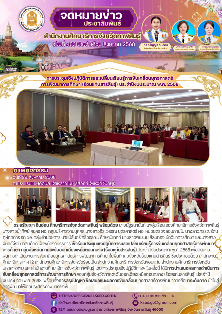วันที่ 29 สิงหาคม 2568ดร.อรัญญา อินอ่อน ศึกษาธิการจังหวัดกาฬสินธุ์ พร้อมด้วย นางนัฐธนานันท์ นาอุ่นเรือน รองศึกษาธิการจังหวัดกาฬสินธุ์ นางสาวน้ำทิพย์ คชศร ผอ. กลุ่มบริหารงานบุคคล นางสาวจีระวรรณ บุตรศาสตร์ ผอ. หน่วยตรวจสอบภายใน นางสาวภรรณรัตน์ภูหัตถการ รก.ผอ. กลุ่มอำนวยการ นายนิรันดร์ ศรีวรรณะ ศึกษานิเทศก์ นางสาวพชรมน สีลุนทอง นักวิชาการศึกษา และนางสาวจันทร์จีรา นาสมภักดิ์ เจ้าพนักงานธุรการ เข้าร่วมประชุมเชิงปฏิบัติการแลกเปลี่ยนเรียนรู้การขับเคลื่อนยุทธศาสตร์การพัฒนาการศึกษา กลุ่มจังหวัดภาคตะวันออกเฉียงเหนือตอนกลาง (ร้อยแก่นสารสินธุ์) ประจำปีงบประมาณ พ.ศ. 2568 ณ โรงแรมแซนด์ดูนส์ เจ้าหลาว บีช รีสอรท์ จังหวัดจันทบุรี เพื่อติดตาม