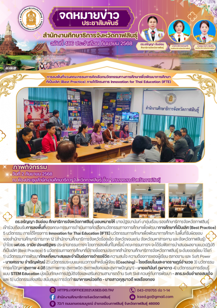 เข้าร่วมต้อนรับการลงพื้นที่ของคณะกรรมการดำเนินการคัดเลืืิอกนวัตกรรมทางการศึกษาเพื่อพัฒนาการศึกษาที่เป็นเลิศ (Best Practice) 5 นวัตกรรม ภายใต้โครงการ Innovation for Thai Education (IFTE) นวัตกรรมการศึกษาเพื่อพัฒนาการศึกษา ในพื้นที่รับผิดชอบ ของสำนักงานศึกษาธิการภาค 12 (สำนักงานศึกษาธิการจังหวัดร้อยเอ็ด จังหวัดขอนแก่น จังหวัดมหาสารคาม และจังหวัดกาฬสินธุ์) นำโดย ผศ.ดร. วานิช ประเสริฐพร ประธานกรรมการฯ โดยการลงพื้นที่ในครั้งนี้ คณะกรรมการฯ จะได้รับฟังการนำเสนอผลงานแนวปฏิบัติ ที่เป็นเลิศ (ฺBest Practice) 5 นวัตกรรมทางการศึกษาที่มีรายชื่อตามประกาศสำนักงานศึกษาธิการจังหวัดกาฬสินธุ์ ระดับยอดเยี่ยม ได้แก่ 1) นวัตกรรมการพัฒนาทักษะที่เหมาะสมและจำเป็นต่อการดำรงชีวิต ความสนใจ ความต้องการของผู้เรียน ตลาดงาน และ Soft Power นายศรราม จำเริญพัฒน์ 2) นวัตกรรมระบบแนะแนวทางสำหรับผู้เขียน (Coaching) – โรงเรียนโนนสะอาดราษฎร์อำนวย 3) นวัตกรรมการแก้ปัญหาสุขภาพ 4 มิติ (สุขภาพกาย สุขภาพจิต สุขภาพสังคมและสุขภาพปัญญา) – นายอภินันท์ ภูผาดาว 4) นวัตกรรมการเรียนรู้ แบบ STEM Education มุ่งเน้นทักษะการปฏิบัติจริงและเสริมความสามารถด้าน Soft Skill ควบคู่กับการพัฒนา – สกร.ระดับอำเภอสมเด็จ และ 5) นวัตกรรมส่งเสริม สนับสนุน การจัดทำธนาคารหน่วยกิต – นางสาวกุสุมาวดี พลเรืองทอง