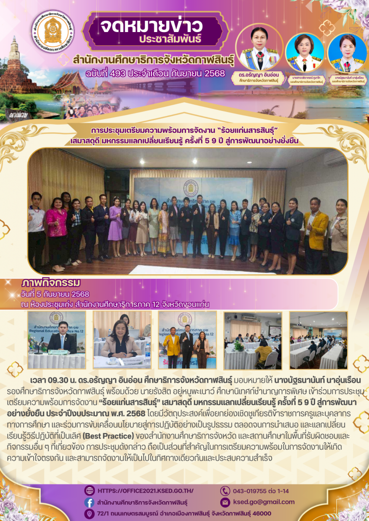 รองศึกษาธิการจังหวัดกาฬสินธุ์ พร้อมด้วย นายรังสิต อยู่หนูพะเนาว์ ศึกษานิเทศก์ชำนาญการพิเศษ เข้าร่วมการประชุมเตรียมความพร้อมการจัดงาน “ร้อยแก่นสารสินธุ์” เสมาสดุดี มหกรรมแลกเปลี่ยนเรียนรู้ ครั้งที่ 5 9 ปี สู่การพัฒนา