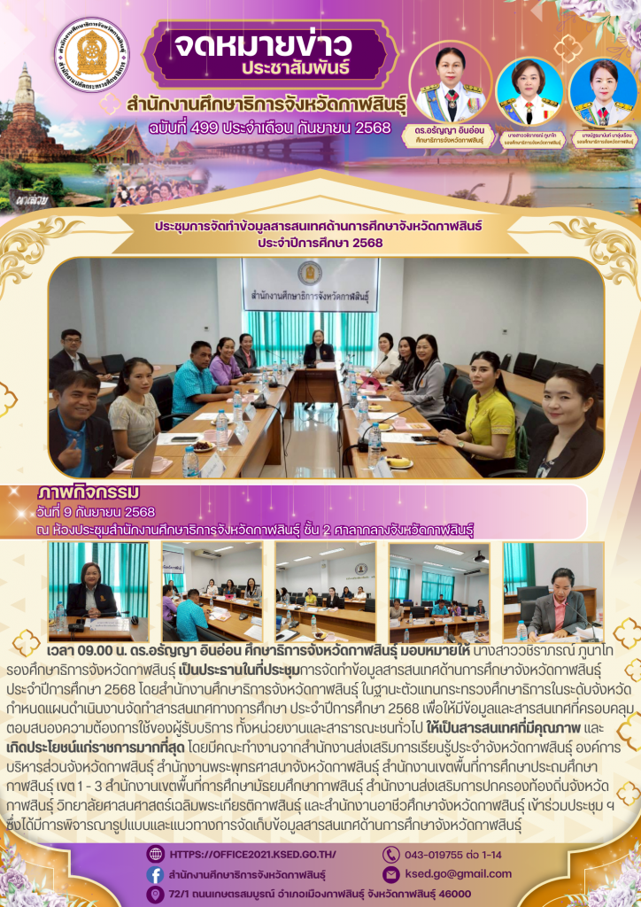 ดร.อรัญญา อินอ่อน ศึกษาธิการจังหวัดกาฬสินธุ์ มอบหมายให้ นางสาววชิราภรณ์ ภูนาโท รองศึกษาธิการจังหวัดกาฬสินธุ์ เป็นประธานในที่ประชุมการจัดทําข้อมูลสารสนเทศด้านการศึกษาจังหวัดกาฬสินธ์ุ ประจําปีการศึกษา 2568 โดยสำนักงานศึกษาธิการจังหวัดกาฬสินธุ์ ในฐานะตัวแทนกระทรวงศึกษาธิการในระดับจังหวัด กำหนดแผนดำเนินงานจัดทำสารสนเทศทางการศึกษา ประจำปีการศึกษา 2568 เพืิ่อให้มีข้อมูลและสารสนเทศที่ครอบคลุม ตอบสนองความต้องการใช้ของผู้รับบริการ ทั้งหน่วยงานและสาธารณะชนทั่วไป ให้เป็นสารสนเทศที่มีคุณภาพ และ เกิดประโยชน์แก่ราชการมากที่สุด โดยมีคณะทำงานจากสำนักงานส่งเสริมการเรียนรู้ประจำจังหวัดกาฬสินธุ์ องค์การบริหารส่วนจังหวัดกาฬสินธุ์ สำนักงานพระพุทธศาสนาจังหวัดกาฬสินธุ์ สำนักงานเขตพื้นที่การศึกษาประถมศึกษา กาฬสินธุ์ เขต 1 – 3 สำนักงานเขตพื้นที่การศึกษามัธยมศึกษากาฬสินธุ์ สำนักงานส่งเสริมการปกครองท้องถิ่นจังหวัดกาฬสินธุ์ วิทยาลัยศาสนศาสตร์เฉลิมพระเกียรติกาฬสินธุ์ และสำนักงานอาชีวศึกษาจังหวัดกาฬสินธุ์ เข้าร่วมประชุม ฯ ซึ่งได้มีการพิจารณารูปแบบและแนวทางการจัดเก็บข้อมูลสารสนเทศด้านการศึกษาจังหวัดกาฬสินธุ์