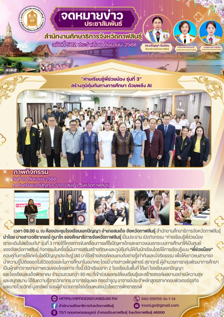 วันที่ 10 กันยายน 2568 เวลา 09.00 น. ณ ห้องประชุมโรงเรียนเอกปัญญา อำเภอสมเด็จ จังหวัดกาฬสินธุ์ สำนักงานศึกษาธิการจังหวัดกาฬสินธุ์ นำโดย นางสาววชิราภรณ์ ภูนาโท รองศึกษาธิการจังหวัดกาฬสินธุ์ เป็นประธาน เปิดกิจกรรม “ค่ายเรียนรู้พี่ช่วยน้อง เราจะเดินไปพร้อมกัน” รุ่นที่ 3 ภายใต้โครงการขับเคลื่อนการแก้ไขปัญหาเด็กและเยาวชนนอกระบบการศึกษาให้เป็นศูนย์ของจังหวัดกาฬสินธุ์ กิจกรรมในครั้งนี้เน้นการเสริมสร้างทักษะและภูมิคุ้มกันให้กับนักเรียนโดยใช้การเรียนรู้แบบ “พี่ช่วยน้อง” ควบคู่กับการใช้เทคโนโลยีปัญญาประดิษฐ์ (AI) มาใช้สร้างสรรค์คอนเทนต์อย่างรู้เท่าทันและมีจริยธรรม เพื่อให้เยาวชนสามารถนำความรู้ไปต่อยอดในชีวิตจริงและในการศึกษาในอนาคต โดยมี นางสาวเพ็ญพักตร์ สุราฤทธิ์ ผู้อำนวยการกลุ่มพัฒนาการศึกษา เป็นผู้กล่าวรายงานภาพรวมของโครงการ ทั้งนี้ มีนักเรียนจาก 2 โรงเรียนในพื้นที่ ได้แก่ โรงเรียนเอกปัญญา และโรงเรียนสมเด็จพิทยาคม จำนวนรวมกว่า 80 คน ที่เข้าร่วมแลกเปลี่ยนเรียนรู้และสร้างสรรค์ผลงานอย่างมีความสุขและสนุกสนาน ได้รับความรู้จากวิทยากร อาจารย์จุมพล ทองจำรูญ อาจารย์ประจำหลักสูตรสาขาคอมพิวเตอร์ธุรกิจ มหาวิทยาลัยกาฬสินธุ์ และนายไวยวิทย์ มูลทรัพย์ รองผู้อำนวยการโรงเรียนหนองบัวไชยวารพิทยาสรรพ์